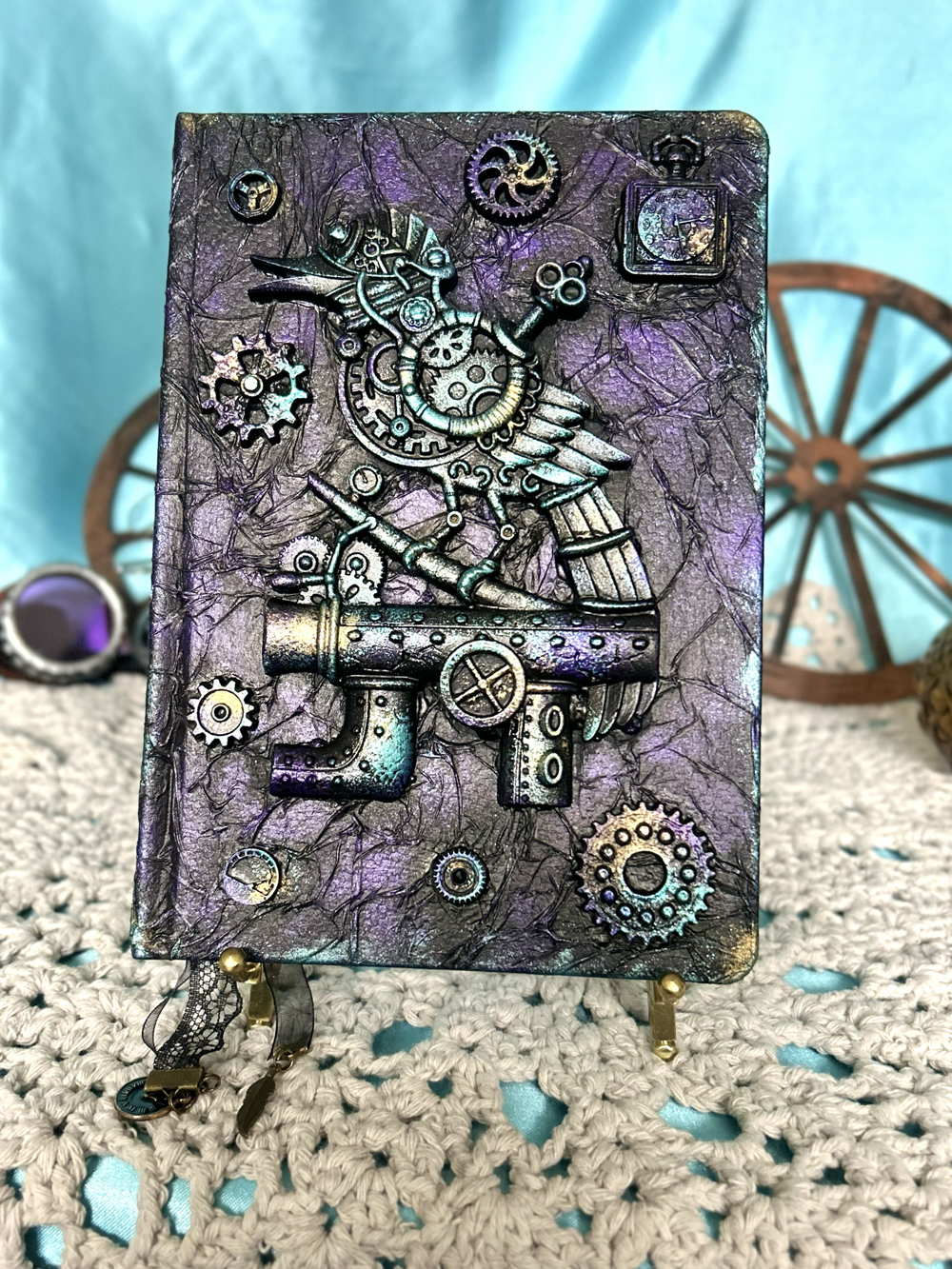 Steampunk style 3D design combines casting resin, decoupage paper, metallic paints, varnish and my own custom mix of acrylics paints to create this inspirational gift for writers.